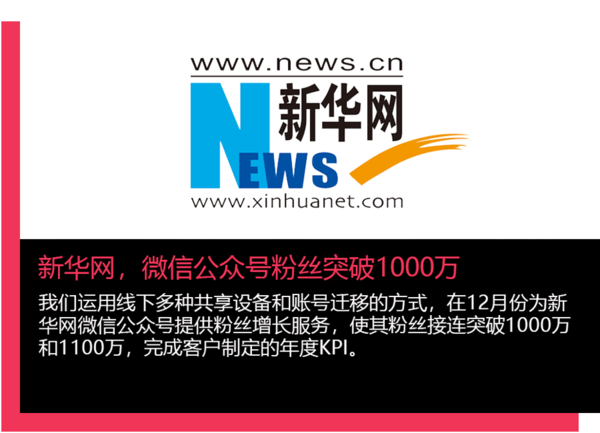 我们运用线下多种共享设备和账号迁移的方式,在12月份为新华网微信公众号提供粉丝增长服务,使其粉丝接连突破1000万和1100万,完成客户制定的年度KPI。